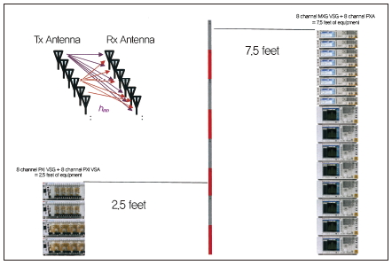 그림 3. 8×8 MIMO의 경우, 측정을 위한 벤치탑은 7.5피트의 높이가 되지 만, 모듈러는 3분의 1인 2.5피트로 크게 줄일 수 있다.