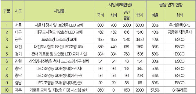 지자체 금융 모델 도입은 사업 재원을 정부 보조에서 민간 자금으로 점진적으로 전환해 지자체와 민간 협력으로 LED 조명 보급을 가속화 할 방안의 일환으로 추진되고 있으며, 현재 10개 지자체에서 시범 추진 중이다(표 1).
