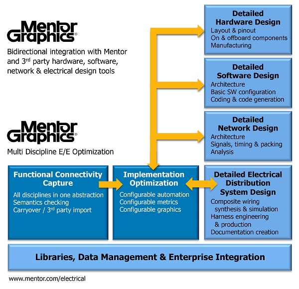 멘토의 통합 전기 시스템 사업부 제너럴 매니저인 마틴 오 브리언(Martin O’Brien)은 “이번에 새롭게 출시된 제품들은 멘토의 Capital 전기 설계 프로세스로, Volcano 네트워크/임베디드 소프트웨어 설계 프로세스로 완벽하게 통합된다”라고 말하고, “이 솔루션들을 활용하면 다른 업체들이 제공하는 툴들과의 데이터 교환도 지원한다. 여기에는 SysML 시스템 모델링과 3D 기계적 모델링과 같은 유사 툴들이 포함된다”라고 말했다.