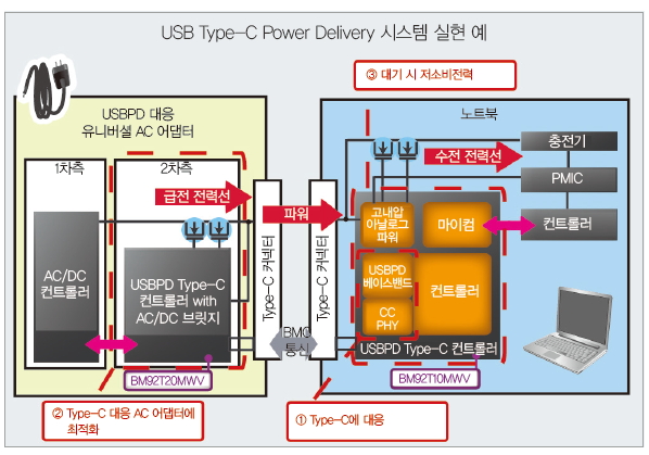 로옴은 기존의 USB Type-A/B 규격에 대응한 USB PD 제어 IC(BD92S 시리즈)와 더불어 최신 USB Type-C 규격 Rev1. 1과 USB PD 규격 Rev2. 0에 대응하는 USB PD 제어 IC(BM92T 시리즈)를 개발했다.