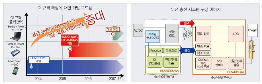 로옴은 타블렛 및 스마트폰 등의 모바일 기기용으로 무선 충전 제어 IC (BD57015GWL : 수신·단말측, BD57020 MWV : 송신·충전측)의 개발을 추진하고 있다.