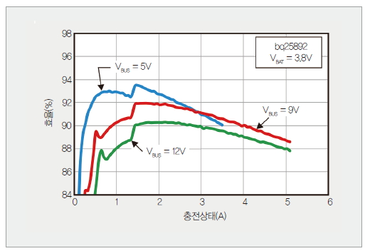 높은 전류에서 이 손실은 내부 FET의 I2R에 의해 좌우된다. 그림 1은 다양한 충전 전류와 입력 전압에서 bq25890와 같은 배터리 충전기의 효율을 보여준다.