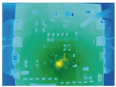 이 구리는 모두 히트싱크 역할을 했다. 그림 2는 4×4mm QFN 패키지의 열 이미지를 보여준다. 여기에서 온도 상승은 IC의 상단 케이스에서 16.1°C였고, 주변온도는 25°C였다. 그림 2에서 냉기는 청색/녹색으로, 온기는 황색으로, 열기는 적색부터 백색까지로 나타난다.