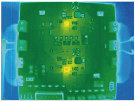 테스트한 PCB에는 그 밖의 다른 전력 소산 IC는 들어 있지 않았다. 따라서 구리 그라운드 영역은 무한 히트싱크와 비슷해져 포화되지 않았다. 이 상태는 IC의 황색 열점 주변의 청색과 녹색으로 증명된다.