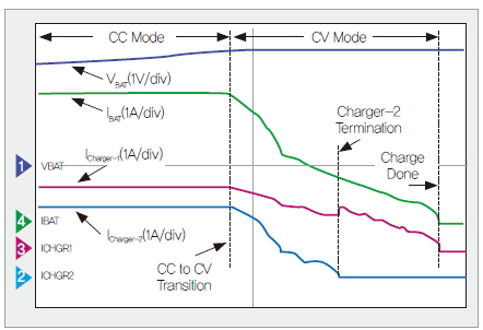 그림 6은 충전기가 정전류 조절에서 정전압 조절로 전환되는 전형적인 충전기-종단 프로파일을 보여주고 있다. 이때는 이전 권고에 따라, 깨끗한 종단을 위해 충전기-2가 충전기-1 앞에서 충전을 종결한다.