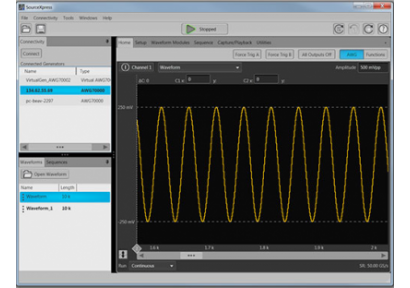 PC 또는 장비에서 바로 실행되는 SourceXpress에는 AWG70000 시리즈의 기본 GUI와 동일한 인터페이스가 탑재되어 있다. 많은 애플리케이션에서 복수의 신호 소스가 필요하며 이 모두는 정밀하게 조정되어야 한다. SourceXpress를 사용하면 복수의 신호 소스를 한 곳에서 제어할 수 있으므로 더욱 빠른 테스트 설정 및 실행이 가능해진다.