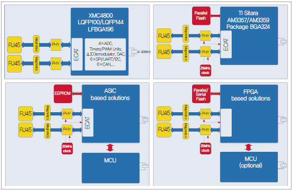 TI Sitara, FPGA, ASIC을 기반으로 한 기존 솔루션들과 비교한 것을 보면 XMC4800을 사용함으로써 EtherCAT을 얼마나 간편하게 구현할 수 있게 되었는지 알 수 있다. XMC4800은 EtherCAT 슬레이브 컨트롤러를 스타트업하기 위해서 외부 메모리나 오실레이터 같은 추가적 부품을 필요로 하지 않는다.