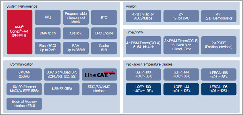 (최대 85℃ 및 최대 125℃)로 총 18개 제품으로 구성되었다. 모든 XMC4800 제품은 모든 XMC4000 마이크로컨트롤러와 코드 호환이 가능하며 같은 패키지끼리는 핀 호환이 가능하다.