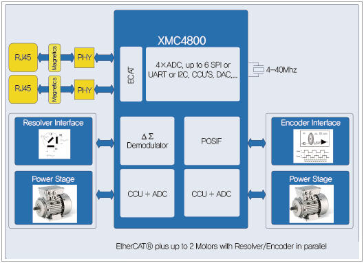 센서 용으로는 4개 12비트 A/D 컨버터, 4개 델타-시그마 복조기, 2개 인코더 인터페이스를 포함하고 있다. 엑추에이터 용으로는 2개 풀-브리지를 제어할 수 있는 2개 타이머 유닛, 하프-브리지 용의 4개 타이머 유닛, 2개 12비트 D/A 컨버터를 포함하고 있다. 그럼으로써 EtherCAT 통신을 동시적으로 실행하면서 리졸버나 인코더를 통해서 위치 검출을 포함해 최대 2개의 모터를 제어할 수 있다(그림 4).