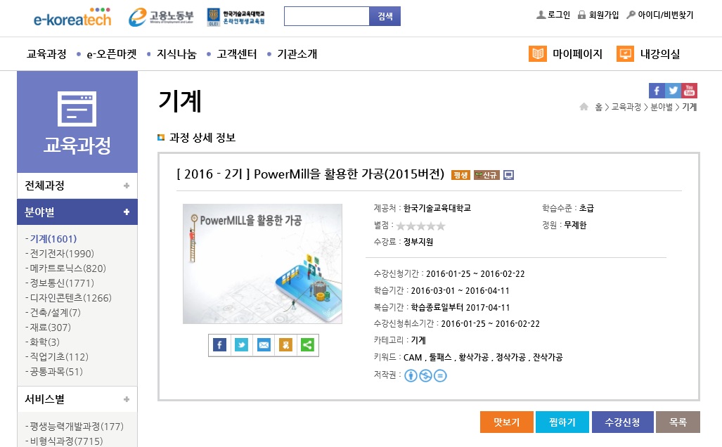 기계공학 전공자, 기계가공 및 기계설계 분야 업무 종사자, CAM 분야와 금형 분야 관심자 등 PowerMILL에 관심이 있는 사람이라면 누구든지 무료로 강의를 수강할 수 있다. PowerMILL E-learning 콘텐츠는 고용부의 위탁을 받은 한국기술교육대학교 온라인평생교육원이 주관하여 NCS 기반 주요 능력 단위에 대하여 분야별 수요 조사 결과를 기반으로 개발됐다.