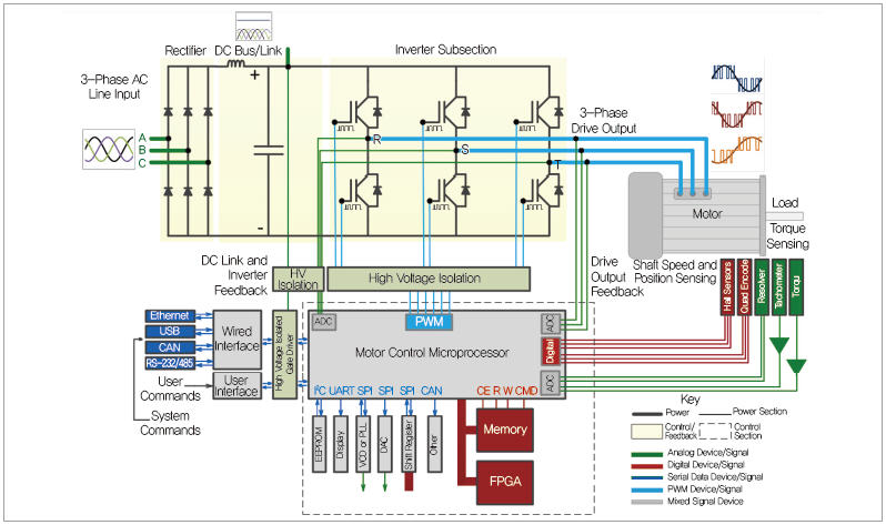완전한 모터 드라이브 시스템의 구성은 삼상 전력 전자공학, 모터/기계의 아날로그와 디지털 센서 그리고 복잡하고 다양한 아날로그, 디지털, 시리얼 데이터 및 펄스 폭 변조신호가 포함된 임베디드 컨트롤로 되어 있다.