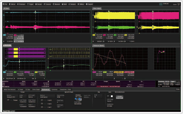 텔레다인르크로이의 MDA800 시리즈 오실로스코프는 모터드라이브 분석 기능을 기본적으로 탑재하고 있어 3-상 입력, DC 링크, 인버터의 출력과 컨트롤러 부분의 측정과 파형 분석이 가능하다.