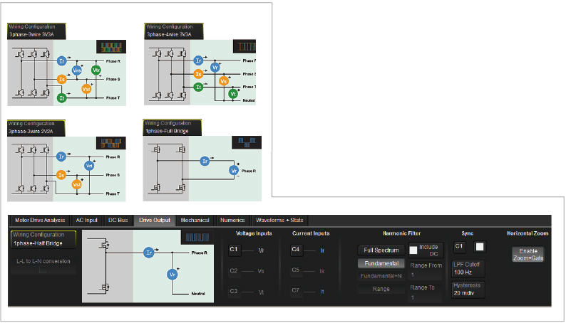 또 측정을 원하는 부분을 쉽게 설정 및 측정할 수 있도록 모터드라이브 분석기 메뉴를 크게 AC-입력, DC 버스, 드라이브 출력, 메카닉컬 피드백 4 부분으로 구분하고 사용자를 위해 프로빙 결선 방법을 안내하는 기능을 추가했다.