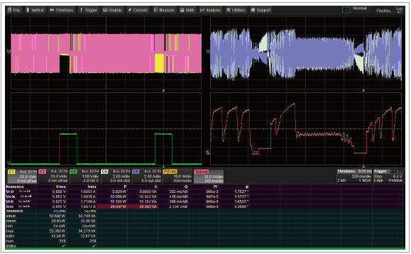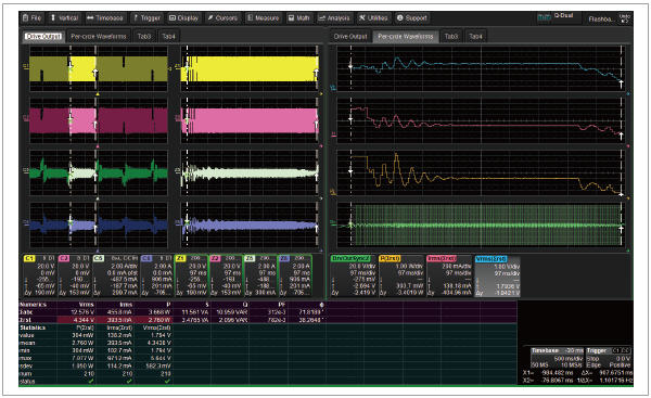 하지만 MDA800은, 충분한 채널 수, 정확한 분석 툴을 가진 오실로스코프 기반의 분석기이기 때문에 이런 과도 상태에서 신호를 포착하고 정확하게 분석할 수 있다. 또한 모든 측정에서 입력 또는 드라이브 출력 신호에 동기된 매 주기마다 파워 값을 측정해, 과도 상태에서의 측정 부분의 파형은 물론 해당 부분의 전력, 효율, 역률 또는 각 파형의 크기 및 모양을 자세하게 관측·측정하여 디버깅에 필요한 정보를 빠르게 제공한다.