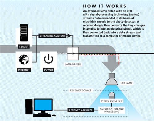 TV 리모컨은 IR신호를 TV에 전달하며 IR신호에 이진수 정보(binary code)를 바꾸는 원리와 동일하다. 하기 그림에서 알 수 있듯이 인터넷과 라우터/서버가 케이블에 연결되어 있으며, 케이블은 가정에 설치되어 있는 LED 전구에 부착된다. LED 전구는 휴대 전화 나 노트북에 광 검출기가 빛의 파장을 포착하고 이를 디코딩하는 동안 빛의 파동을 변조하여 데이터를 전송한다.
