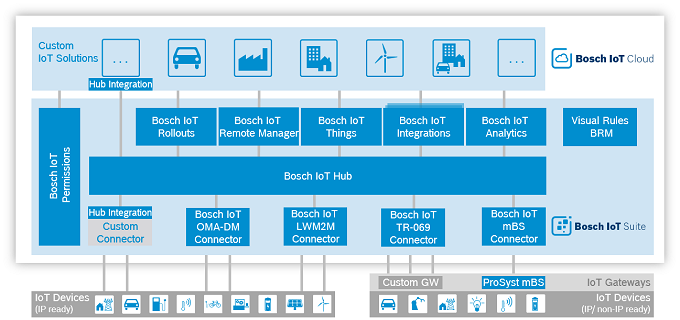 보쉬에 따르면, 보쉬 IoT 클라우드의 소프트웨어 핵심은 보쉬의 IoT 스위트(Suite)이다. IoT 스위트는 웹 기반의 모든 기기를 인식하고 데이터 교환을 관리하며 다수의 서비스 및 비즈니스 모델들을 실현 가능하게 해준다. 빅 데이터 관리는 방대한 데이터의 분석을 가능하게 해준다. 보쉬는 “Bosch IoT Suite는 커넥티드 세상의 브레인이다. 이는 기기, 사용자, 기업들을 연결하기 위해 필요한 모든 기능들을 제공한다”고 말했다.