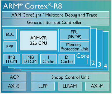 코어텍스 R8은 쿼드 코어로 구성되어 전반적인 성능을 획기적으로 개선시켰다. 특히 실시간(Real-time) 기능과 더 낮은 레이턴시 메모리가 결합하여 동급 최강의 성능을 발휘한다.
