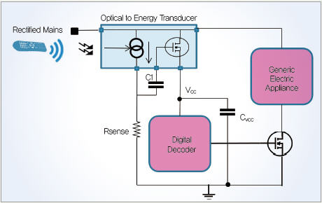 근본적인 아이디어는 소량의 광학 에너지를 모든 전자 제품을 켤 수 있는 충분한 양의 전기 에너지로 변환하는 것이다.[1], [2] 문제는 기존의 IR 리모컨이 에너지를 공급할 목적이 아니었기 때문에 제공되는 광학 에너지가 그다지 높지 않다는 것이다. 이러한 이유로, 트랜스듀서는 고전압이면서 매우 효율적이고 신중하게 설계되어야 한다.