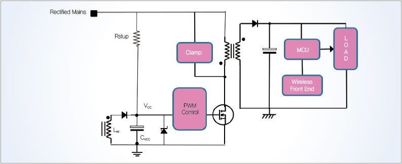 그림 3은 일반적인 스위칭 전원 공급 장치이다.[3] 이 회로에서는 PWM 컨트롤러가 VCC 입력을 통해 바이어스된다. 저항 Rstup과 제너 다이오드 DZ1은 PWM 컨트롤러 구동에 적합한 전압(약 10∼15V)을 제공한다.