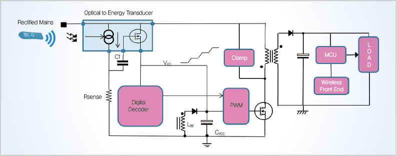 또한 PWM 컨트롤러는 디지털 디코더가 스타트업 버스트에 내장된 코드를 승인한 경우에만 시작할 수 있다. 단지 이 시점에서는, 전원공급장치가 전용 권선형 변압기 Lw를 통해 자가 바이어스(Self-bias)된다. 플러그가 여전히 연결되어 있는데도 시스템이 꺼진 경우, 전력을 소비하지 않고 광학에너지를 사용해 원격으로 시스템을 켤 수 있다. 이 아키텍처와 관련하여 주목할 만한 점은 BOM 비용과 회로 복잡도를 낮춰 더 이상 보조 전원이 필요 없다는 것이다.