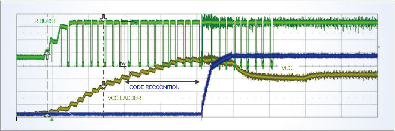 그림 7에 나타난 바와 같이, IR 버스트가 없으면 회로에 전원이 공급되지 않는다. 여러 번의 IR 버스트 후 VCC 노드는 에너지를 얻게 되고, 이 전압은 디지털 디코더에 전원을 공급할 만큼 충분히 증가한다. 코드가 감지된 다음에는 PWM_ENAB가 상승하고, 전력 관리는 변압기의 2차 권선에서 자가 공급된다. IR 버스트(스타트업 시퀀스)가 종료되면, 시스템은 계속해서 작동한다.