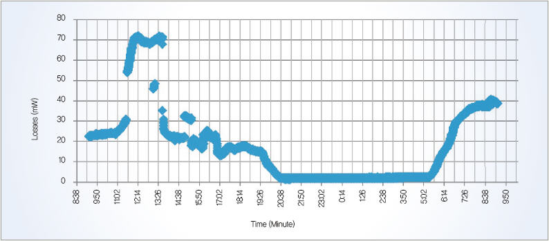 그림 8은 빛 노출 실험을 위해 여름(2014년 6월)에 24시간 동안 남향 창가에 놓아둔 기판의 시간 대비 누설 손실을 나타낸 것이다. 누설로 인해 최대 전력 소비는 정오(직사광선)에 70mW이며, 18mW의 평균 ‘대기’ 전력을 소비하는 밤에는 1.4mW가 되었다.