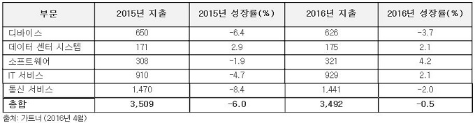 글로벌 IT 자문기관인 가트너(Gartner)는 2016년 전세계 IT 지출이 2015년 3조 5천억달러에서 0.5% 감소한 3조 4900억달러에 이를 것으로 전망했다. 이는 지난 분기에 발표했던 0.5% 성장할 것이라는 전망에서 조정된 것으로, 가트너는 환율 변동이 전망 변화의 주된 원인인 것으로 분석했다.