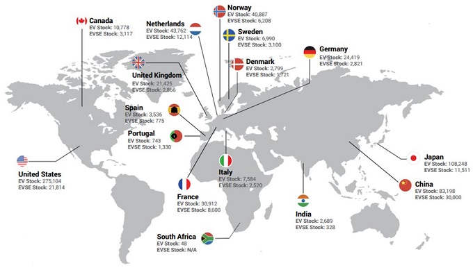2010년 세계 15개국 정부와 국제에너지기구(International Energy Agency, IEA)는 전기자동차 시장 개발을 위해 국제에너지장관회의(Clean Energy Ministerial, CEM)에서 EVI(Electric Vehicles Initiative, EVI)라는 전기자동차관련 리더십포럼을 결성했다. 15개 글로벌 EVI 포럼국가와 국가별 전기자동차 현황은 그림 1과 같다. IEA와 EVI는 2013년 그동안의 글로벌 전기자동차관련 다양한 통계자료와 정보를 기초로 ‘GLOBAL EV OUTLOOK’ 보고서를 최초로 발행하였으면, 이 보고서는 2015년 일부 내용을 업데이트했다.