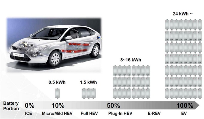 ▲친환경자동차 동력에서의 배터리 비율 및 용량 <출처: LG화학>