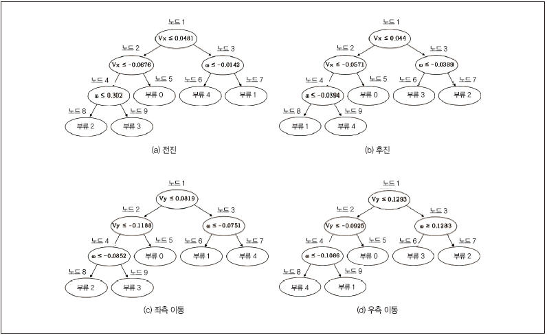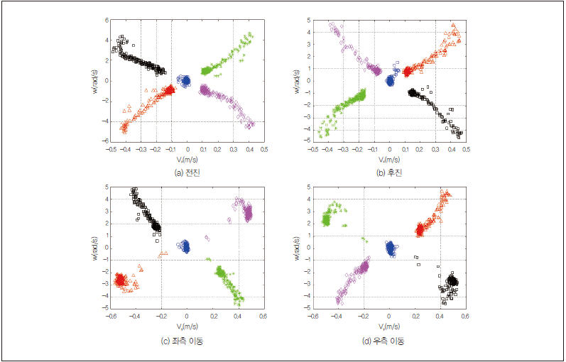 결정트리 학습을 위해 전진, 후진, 좌측, 우측 이동 상황에서 정상적으로 동작하는 상태와 1개 의 바퀴에 고장이 발생한 상황에 대해 훈련 집합을 수집한다. 정지 상태에서 3초 동안 이동했을 때, 운동 상태를 훈련 집합으로 한다. 수집된 훈련 집합을 이용하여 결정트리를 학습 알고리즘을 이용하여 학습시킨다. 그림 7에 표시된 분포그래프는 각 운동 상황에 대한 훈련샘플의 분포를 나타낸다. 그림 7의 분포그래프에 표시된 마크 ○, 十, △, □, ◇는 각각 정상 상태 그리고 1번 모터, 2번 모터, 3번 모터 및 4번 모터가 정지된 상태를 나타낸다.