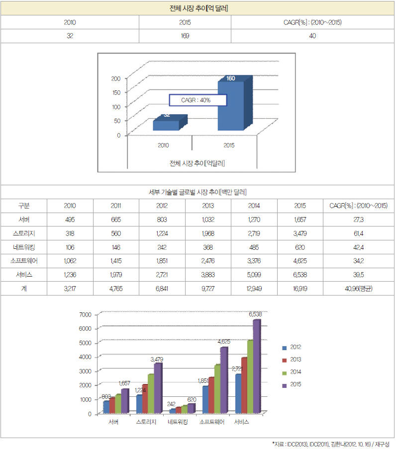 - 세부 기술 분야의 2015년 예상 시장 규모는 서버 시장이 16억5,700만 달러, 스토리지 시장이 34억7,900만달러, 네트워킹 시장이 6억2,000만달러, 소프트웨어 시장이 46억2,500만달러, 서비스 시장이 65억3,800만달러를 기록하여 총 169억1,900만달러의 대규모 시장 성장과 아울러 연평균 41%의 높은 성장률을 기록할 것으로 예상된다.