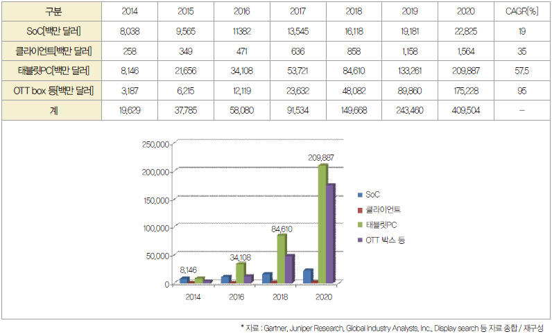 - 태블릿PC 시장 규모는 2014년 81억4,600만 달러에서 2020년에는 2,098억8,7400만 달러의 초대규모 시장 형성이 예상된다.