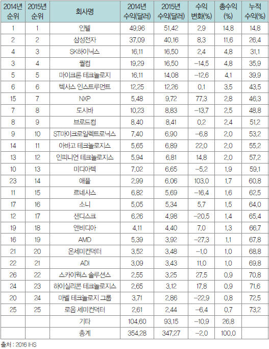 ▲ 표 1. 상위 25개 글로벌 반도체 업체의 2015년 매출 현황 (단위 : 10억 달러)