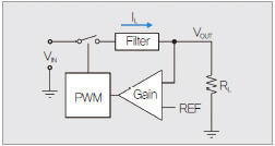 그림 1에 나타난 선형 레귤레이터의 경우, 전력 손실과 효율은 식 (1)과 식 (2)로 정해진다.
