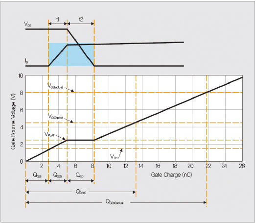 그림 6에 나타난 스위치 MOSFET의 경우, 식 (5)의 낮은 게이트 전력(QG)이 전력 손실을 낮춰 주고 스위칭 시간을 빨라지게 할 수 있다.