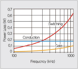 R은 선택한 MOSFET의 RDS(on)이고, I는 그 MOSFET을 거치는 실효(Root-Mean-Square ; RMS) 전류이며, 또한 둘 중 어느 쪽도 스위칭 주파수와 함수 관계에 있지 않다는 점에 유의해야 한다.