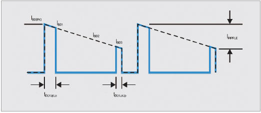 그림 9의 청색 파형은 데드타임을 나타낸다. 이것은 하이사이드 FET가 턴오프할 때와 로우사이드 FET(정류기 FET)가 턴온할 때의 중간 시간을 의미한다. 그 스위칭 사이클에서 평균 전류를 구한다.