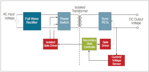 그림 1은 전형적인 AC-DC SMPS 블록 다이어그램이다. 먼저 AC 입력 전압을 DC 전압으로 정류한다. 이때 변조를 제어하기 위해 게이트 드라이버를 사용하는 전력 스위치단은 DC 전압을 변조시킨다. 컨트롤러는 신호를 발생시키고 게이트 드라이버가 이를 사용해서 전력 스위치를 변조한다. 이 스위치된 전압은 절연 트랜스포머를 거치면서 출력에서 적절한 전압 레벨을 달성하도록 원하는 권선 비율로 결합시킨다. 그런 다음 동기 FET에서 이 전압을 다시 DC로 정류한다. 이 동기 FET 역시 자신의 스위칭을 제어하기 위해 게이트 드라이버가 필요하다. 전류 및 전압 센서들이 출력을 모니터링하고 컨트롤러로 피드백을 제공함으로써 변조를 세밀하게 조절해 최대의 성능을 달성할 수 있다.