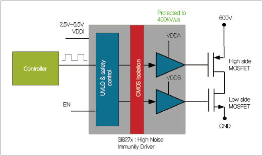 전원 공급장치 설계자들은 가급적 고속 전원 스위칭 기술을 사용해서 시스템의 W/mm3를 극대화하려고 한다. 최신 GaN 및 SiC 기반 스위치는 매우 빠른 기술이며, 이것을 사용하려면 잡음 내성(CMTI)이 상당히 높은 게이트 드라이버가 필요하다. 실리콘랩스의 최신 제품인 정전용량 커플 게이트 드라이버는 여유로운 마진으로(120kV/㎲ 요구 시 200kV/㎲ 제공) GaN 및 SiC의 잡음 내성 요건을 충족시킨다. 설계자는 새로운 Si827x 절연형 게이트 드라이버를 통해 시스템 효율과 W/mm3를 극대화할 수 있다.