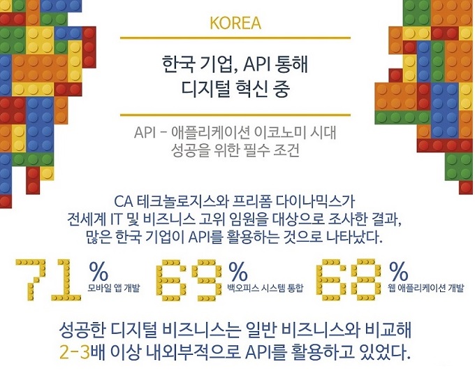 한국 CA 테크놀로지스(대표 마이클 최)는 많은 한국 기업이 애플리케이션 프로그래밍 인터페이스(API)를 활용해 디지털 혁신에 나서고 있다고 밝혔다.