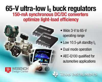TI가 10.5uA 정지 전류(IQ)의 65V, 150mA 동기식 DC/DC 벅 컨버터 2종을 출시한다고 밝혔다. 이들 신제품은 고효율을 요구하는 공장 자동화 및 오토모티브 센서 애플리케이션에 적합하다.