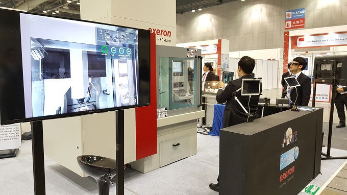 ▲ SIMTOS 2016 스마트팩토리특별관에서 AR FACTORY SOLUTION을 실제로 시연하고 있는 모습