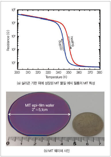▲ 실리콘 기판 위에 성장된 MIT 물질 에피 필름의 MIT 특성과 MIT 웨이퍼