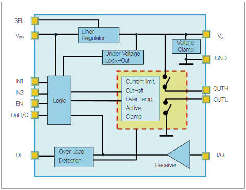 (그림 2)는 ‘L6362A’ 디바이스의 블록 다이어그램을 보여준다. 온칩으로 3.3V/5V 리니어 레귤레이터를 통합했으며, SEL 핀을 통해서 출력 전압을 선택할 수 있다. 최대 출력 전류는 12mA이다. 이 전압 레귤레이터가 내부 로직에도 전원을 공급하며, 이 로직은 투명한 인터페이스를 통해서 매우 작은 Rds(on) 출력 스테이지(1Ω정격)를 구동한다.