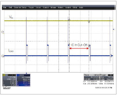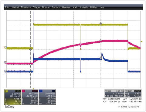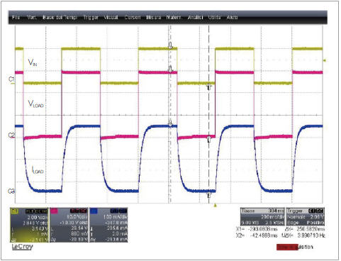 (그림 6)에서는 L6362A로 연결된 RC 부하를 3.5ms 지속시간의 2개 펄스만을 사용해서 Vcc=24V로 충전하는 것을 볼 수 있다(Vin 녹색, Vload 빨간색, Iload 파란색).