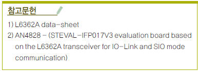 ‘L6362A’는 디지털 센서 및 엑추에이터 인터페이싱에 최적화된 트랜시버 디바이스이다. ‘L6362A’는 IO-Link 통신 프로토콜을 충족시키는 정교한 솔루션을 구현할 만큼 지능적이면서, 범용 I/O 시스템에도 사용할 수 있을 정도로 간편하다. 소형 DFN 패키지에 독보적으로 극히 낮은 Rds(on)을 함께 제공한다. 또한 높은 값의 전력 스테이지를 제공하고, 높은 값의 커패시터와 추가적인 대형 인덕터를 구동할 수 있으면서 가격이 저렴하다.