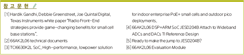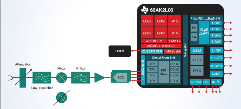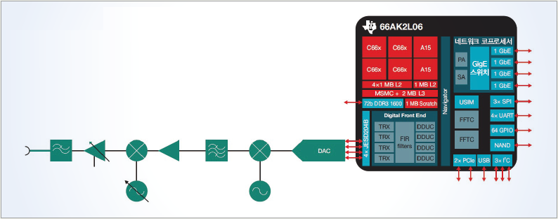 TI의 KeyStoneⅡ 아키텍처를 기반으로 하는 66AK2L06 SoC는 확장 가능한 저전력 솔루션으로, 통합 FFT 하드웨어 가속과 DFE, 고속 JESD204B 인터페이스, 네트워크 코프로세서, 통합 GBE 스위치 등의 프로세싱 시스템을 갖추고 있다.