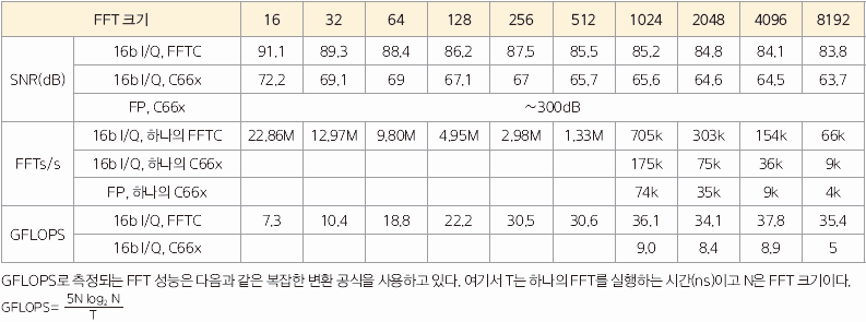 표 2는 Fast Fourier Transform의 구현 방식[FFTC에서의 16b 고정소수점 I/Q, C66x에서의 16b 고정소수점 I/Q, C66x에서의 부동소수점(FP)]에 따라, 66AK2L06 SoC에서 기대되는 성능을 보여준다.