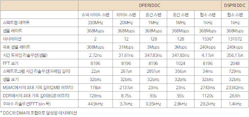• DFE의 DDUC 블록은 캡처된 샘플의 다운 변환과 데시메이션을 지원한다(I/Q 페어). 데시메이션은 샘플링 레이트를 사용자가 요구하는 주파수 범위에 맞추는 데 사용된다.