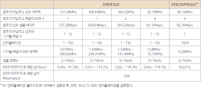 구성에 따라, 각 DUC 필터 블록은 최대 12개 디지털 채널을 동시 처리할 수 있다. DFE의 DDUC 블록은 다음을 지원한다.